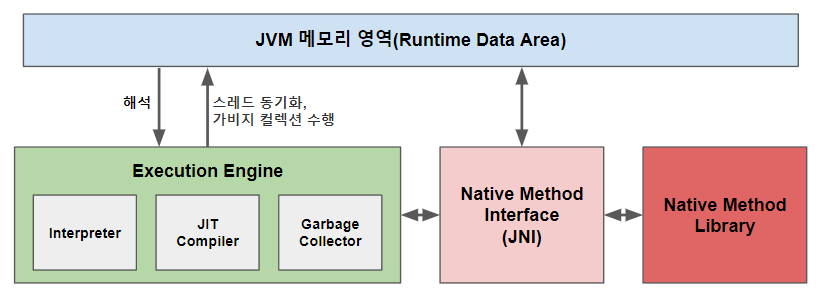 Execution Engine은 로드된 클래스 파일의 바이트 코드를 실행하는 엔진으로 바이트 코드를 실행하기 위해서는 컴퓨터가 이해할 수 있도록 기계어로 변환하는 작업이 필요하다. 이러한 수행 작업은 Interpreter와 JIT 컴파일러 두 가지 방식을 혼합하여 실행한다.