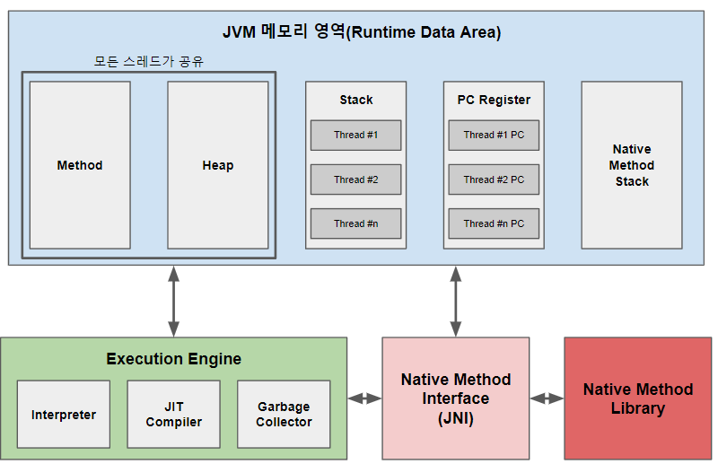 - Runtime Data Area에 로딩된 바이트 코드는 Execution Engine을 통해 해석된다.