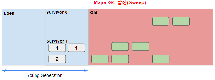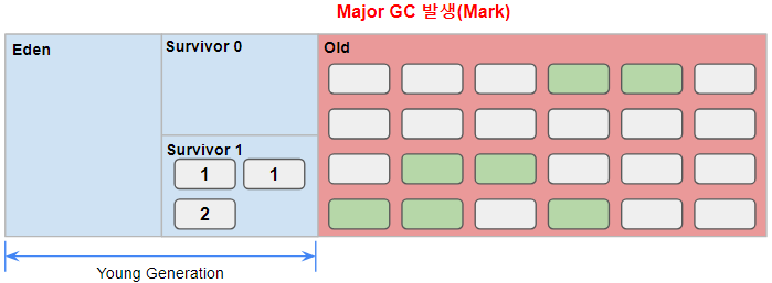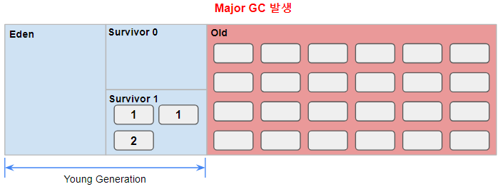 Promotion에 의하여 Old Generation 영역의 메모리가 부족해지는 시기가 온다. 이때, Old Generation은 Major(Full) GC를 실행한다.