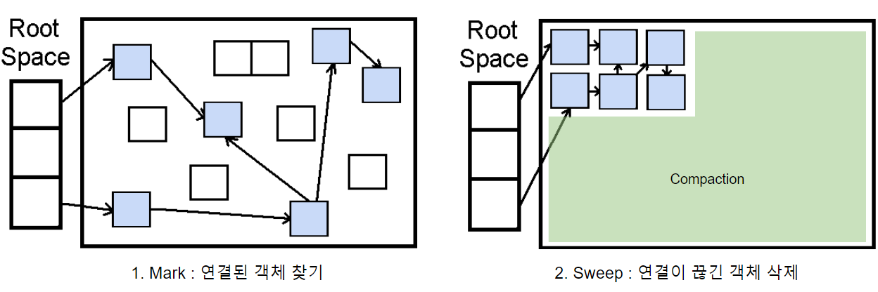 - Mark : Root Space로부터 그래프 순회를 통해 연결된 객체를 찾아내 각각 어떤 객체를 참조하고 있는지 찾아 마킹한다.
