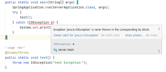 @SneakyThrow를 사용한 메서드를 호출하면서 try-catch문에 해당 Exception을 catch하고자 하였을 때 컴파일러에서 IOException이 try 블록에서 절대 발생하지 않는다며 코드 변경을 요구했다.