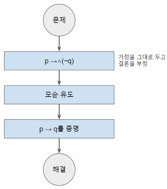 p→q가 참인 것과 p →∧(~q)가 거짓임은 동치임으로 p →∧(~q)가 참이라고 하고 모순이 유도되면 원래의 명제가 참임을 증명하는 것이다.