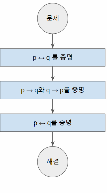 - 간접 증명 : 논리적 동치를 이용하거나 다른 특수한 방법으로 증명하는 것
