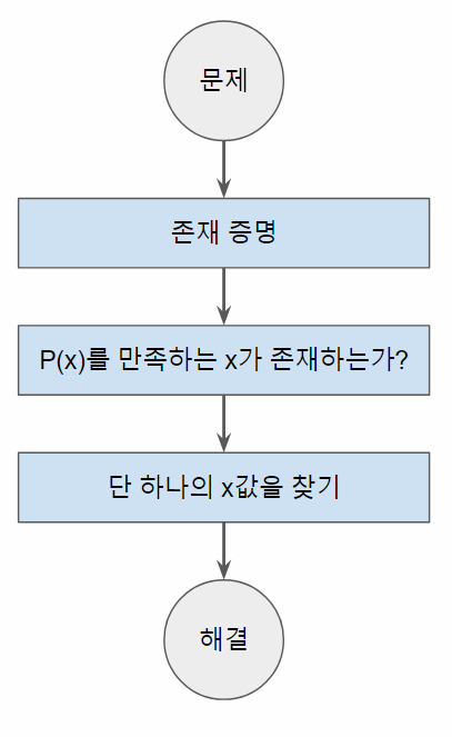 P(x)를 x라는 변수를 가지는 명제라고 할 때, P(x)가 참인 x가 적어도 하나가 존재한다는 것을 보이는 증명 방법이다.
