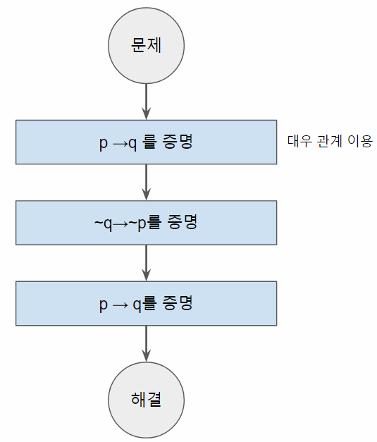 대우 관계에서 논리적 동치가 됨을 이용하여 명제가 참이 되는 것을 보여주는 증명 방법이다.