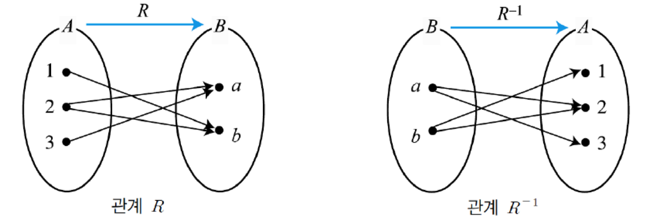 집합 A에서 집합 B로의 관계 R에 대한 역관계(Inverse relations) R^-1는 집합 B에서 집합 A로의 관계를 나타낸다.