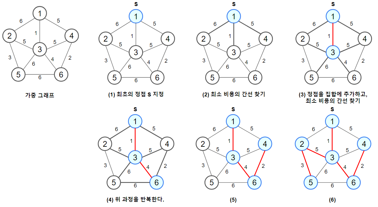 - 정점 집합에서의 모든 정점에 연결된 간선들 중 최소 비용을 찾아 반복한다.