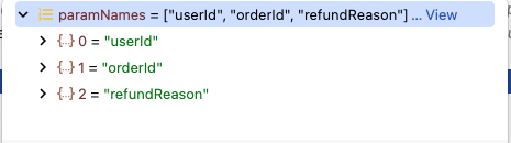 위 처럼 cancelOrder()는 userId 와 orderId를 명시하고, approvalPayment()는 request를 사용하겠다 명시한다. 이어서 어드바이스가 실행되고 JoinPoint에 의하여 아래와 같이 데이터를 추출할 수 있다.